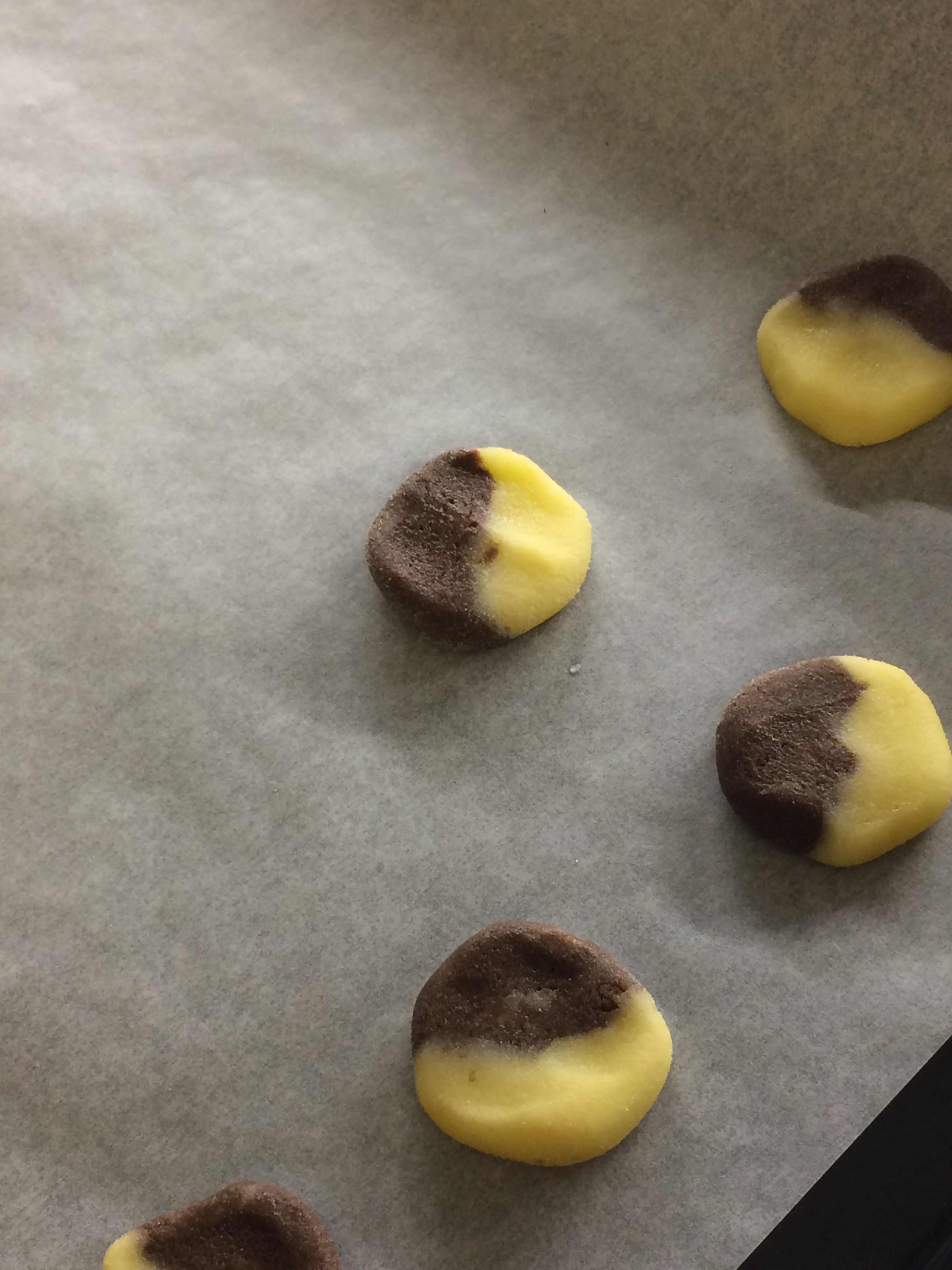 solju, vanilin šećerom, jajetom i vanilijom. Preko smjese prosijte brašno i od svih sastojka zamijesite glatko tijesto. Tijesto će samo po sebi biti dosta ljepljivo no to je u redu. Tijesto prepolovite pa u jednu polovicu stavite kakao kako bi dobili tamno tijesto. Mijesite dok ne postane jednolične boje. Svaku polovicu zasebno umotajte u foliju i stavite u hladnjak barem na pola sata, idealno 2 h. Prepolovite oba tijesta i oblikujte po jedan valjak i po jednu plahtu. Umutite žumanjak sa vrhnjem te premažite plahte. Na njih stavite valjak u suprotnoj boji i zarolajte. Pazite da se dobro spoji tijesto kako e bi došlo do rupa ili pucanja prilikom pečenja. Još jednom ostavite mirovati u hladnjaku kako bi se tijesto stegnulo i kako bi lakše mogli narezati valjke na kolutiće. Pecite oko 10 minuta na 180 stupnjeva.