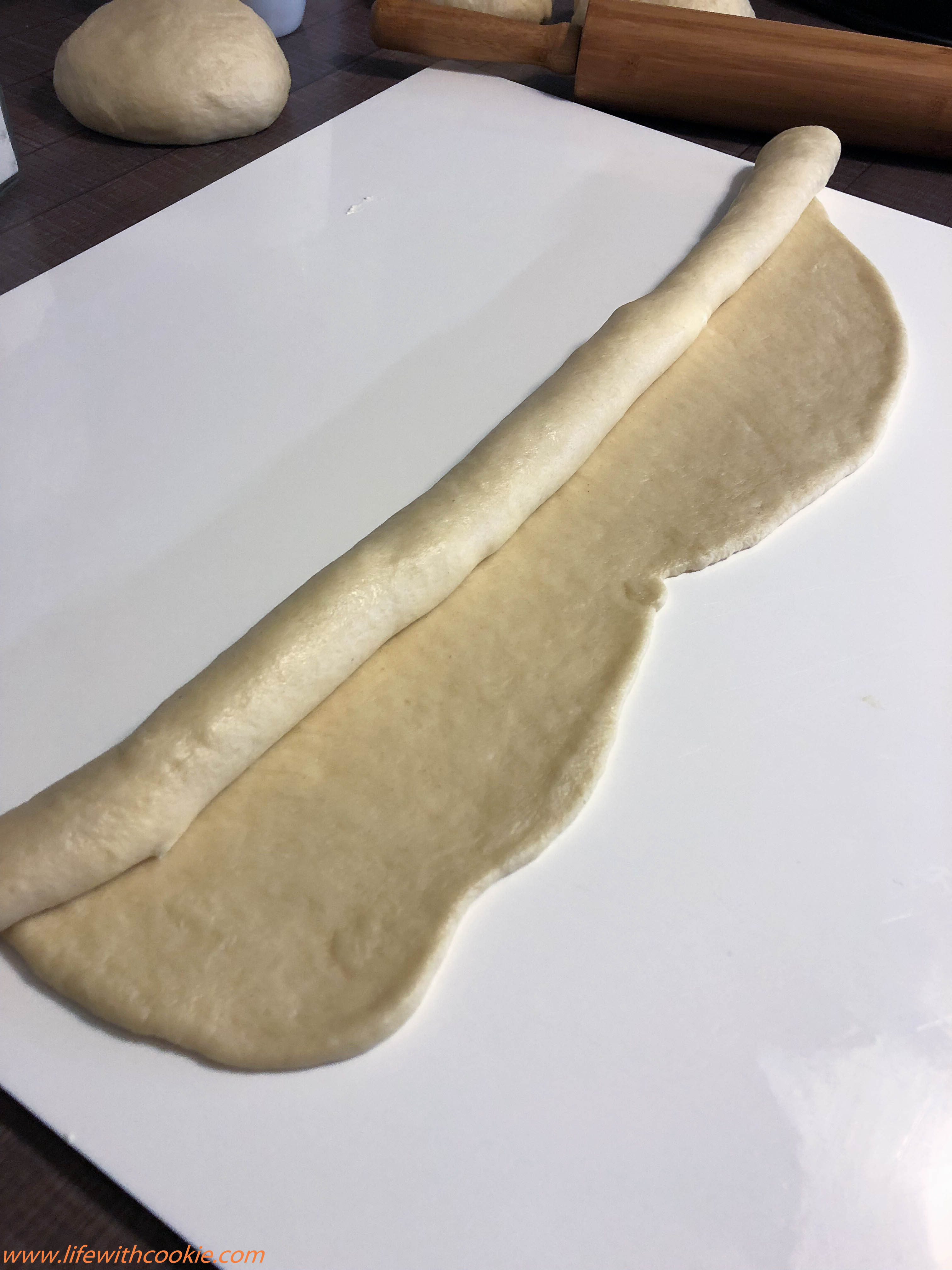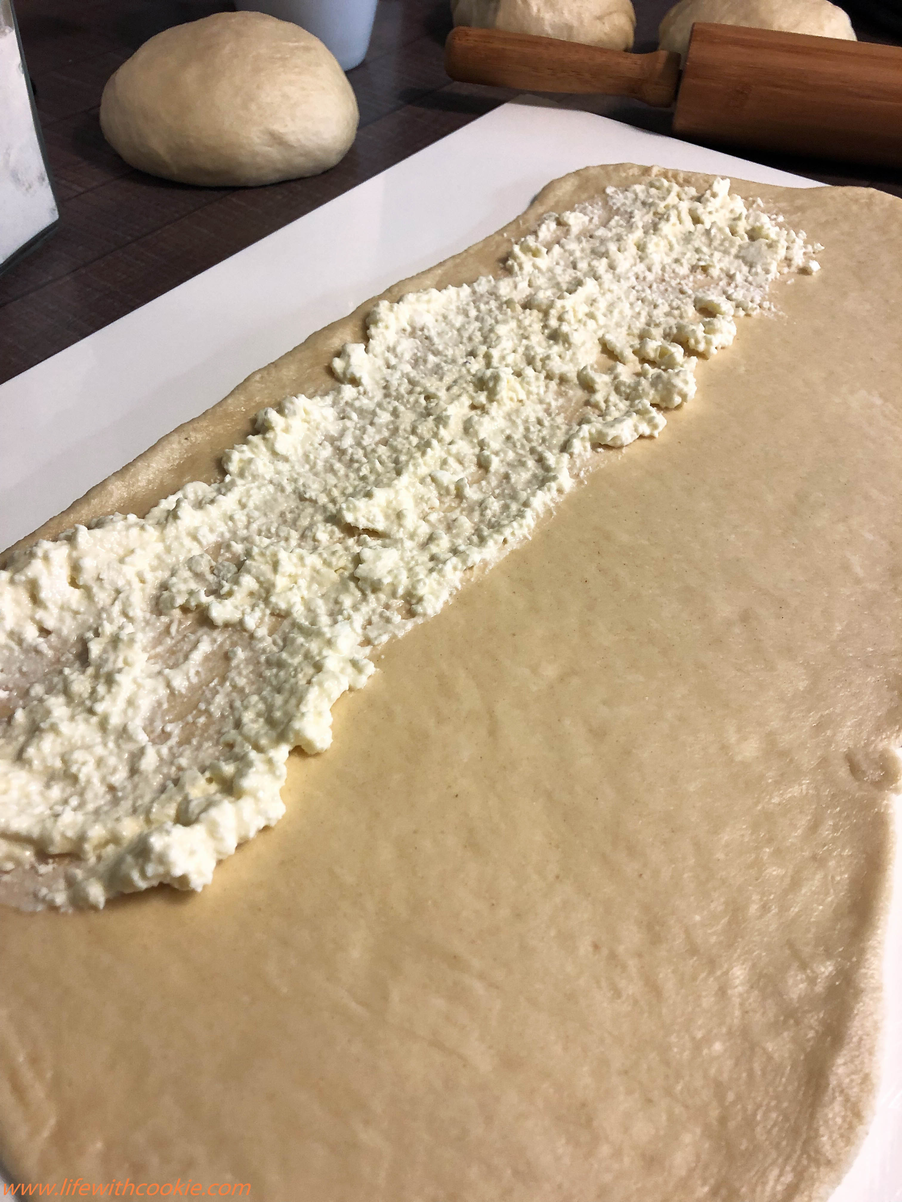 - Zamjesite glatko tijesto i razdjelite na 6 jednakih dijelova. Svaki dio razvaljajte u pravokutnik. Na vrh stavite nadjev i zarolajte (Nadjev napravite jednostavno,tako da sve sastojke međusobno izmiješate 🙂 ).