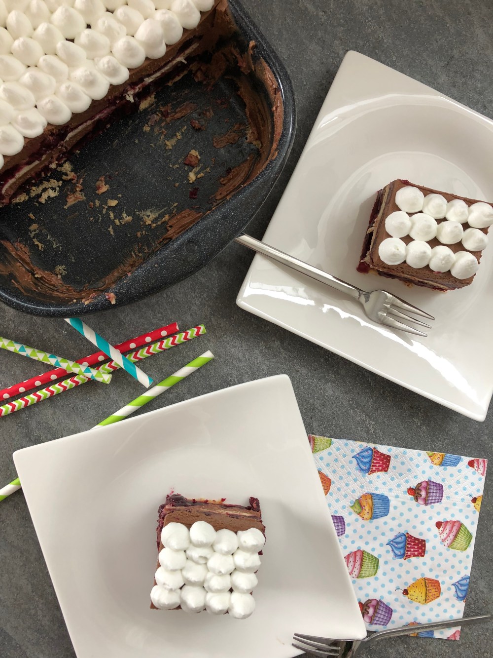S obzirom da ga je ona sama trebala napraviti to nije smijelo uključivati pećnicu. Ipak za te stvari je premala. Tako da sam se na kraju odlučila na čokoladni mousse s višnjama i petit keksima.